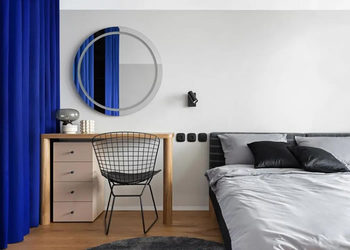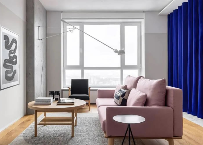 客廳中的淺粉色沙發傳遞出溫柔而舒適的氣質。寶藍色的窗簾作為軟隔斷,色彩跳脫卻又和諧,與公寓里其他家具和材料形成對比。